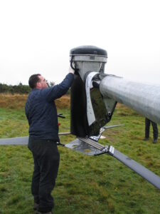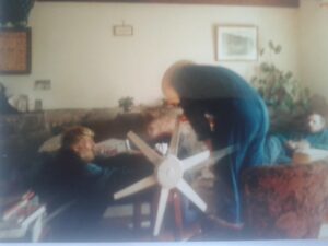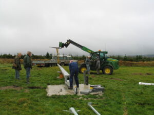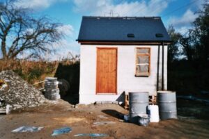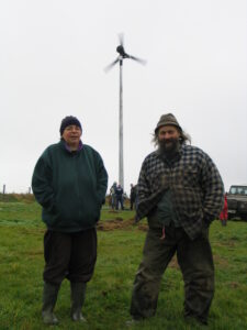 Although this system worked well as a back up we began to need consistent electrical power more regularly to support the medical needs of our youngest child Mair . Around 2000 we enquired about the cost of installing mains power . £40,000 plus we were quoted . Gratefully at the time we met Charles Holford of West Wales Renewables who guided us through installing a 2:5 kw Proven Wind turbine from a company in Scotland . Small wind turbines had just started to be safer and more powerful . Being a bigger system than the Rutland we had to build a place to store all the electrical gear .