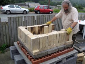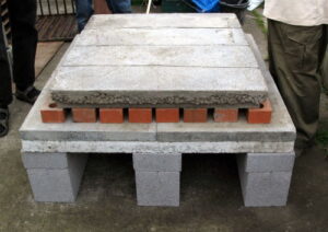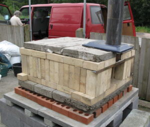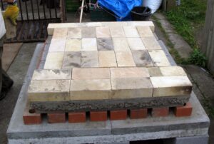 Stage 3: Placed Concrete Lower Hearth ( reservoir ) on engineering bricks . ( concrete made from special mix same as used in Bakery oven