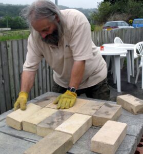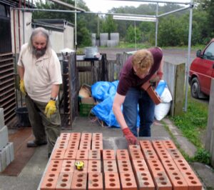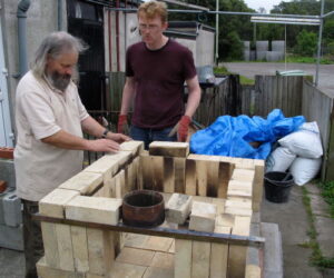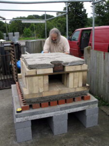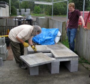 Stage 5: Roof made from same Concrete mix as lower hearth placed over bricks . Roof edges had been moulded to fit over and secure bricks .