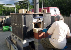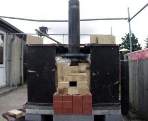 Stage 7: Fire up !! Oven was built in the morning , fired up in afternoon and pizza was baked in the evening . The following morning the oven was refired and Bread was baked in the afternoon . Results to be honest were mixed ( some burnt examples ) but all in all good fun . A big thank you from me to friends John Davis and crew for pouring concrete Heath and Roof . Friend Jonathan Hudes for welding work on outer frame and friend Adam for helping assemble the oven on day and bravely put first pizza in !! My role was to design , test build and transport the BODGER !!!!