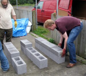 Stage 1: Concrete blocks straddled with reinforced lintels placed on ground .