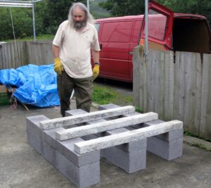 Stage 2 : Four paving slabs laid on Lintels and topped with engineering bricks to dissipate any heat escaping from Hearth . ( Space allowed round edge of structure to fix outer support later )